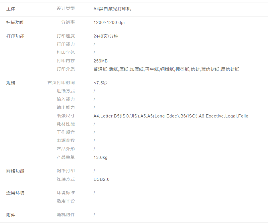 A4黑白激光打印機(jī);40ppm;1200×1200 dpi;PCL6, BR-Script3, IBM Proprinter XL, Epson FX-850, PDF Version 1.7, XPS Version 1.0;256MB;標(biāo)配雙面打?。粯?biāo)配網(wǎng)絡(luò)打印